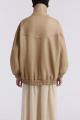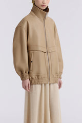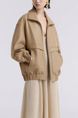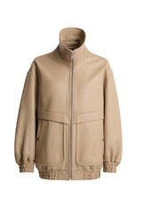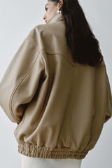 A sculpted bomber in richly textured leather. Rounded shoulders and eased proportions. Ribbed hem and oversized pockets. Fastens with a metal zip.