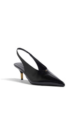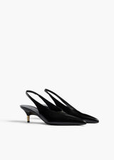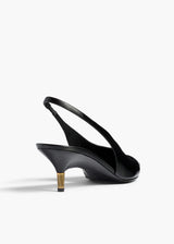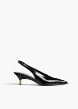 A pointed-toe slingback heel defined by decisive lines, exquisite materials, and sublime details, including signature Empire hardware of 18-karat-gold-plated brass that tips the sculpturally wrapped wedge heel. Lasted construction, crafted in Italy of supple and luminous baby calfskin. Lined in goatskin.