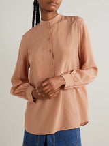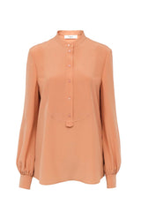 Fluid blouse in organic silk georgette with bib detail, a band collar, and a half button placket down the front.