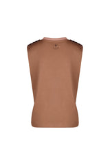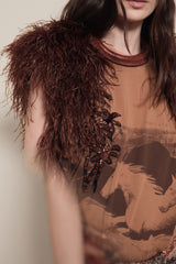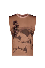 A cotton tank with a horse landscape motif and hand-applied beaded palm embellishments at the shoulders. Its sculpted shape makes it a standout base-wear it with tailored trousers or sharp outerwear for contrast.