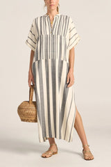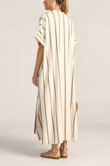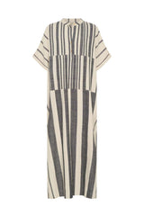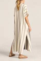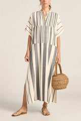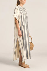 The Castor Caftan redefines relaxed elegance with its flowing silhouette and thoughtful details. Crafted from our signature broken stripe in a neutral colourway—an intricate fabric that takes days to create on traditional handlooms. This collarless caftan features three polished gold buttons for subtle shine. Short sleeves are softly rolled and buttoned in place, while side slits offer ease and graceful movement. A celebration of craftsmanship and effortless style, the Castor Caftan is a timeless addition to any wardrobe.