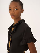 Short-sleeve ruffled top in organic silk crêpe de chine with mother-of-pearl buttons.