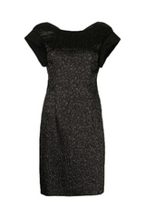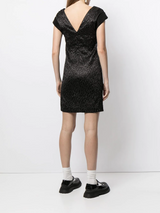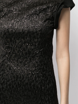This Balenciaga metallic black dress features an all over crinkle texture. It has capped sleeves, a boat neckline and a v back.