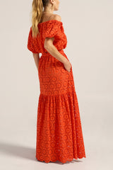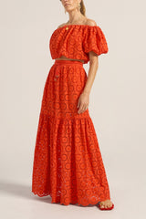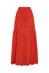 The Cyprian Skirt, crafted from a vibrant red cotton eyelet that radiates confidence and charm. The high-waisted silhouette flatters beautifully, while a tiered design creates luxurious volume and graceful movement. For the complete look, style it back with the coordinating top.