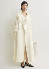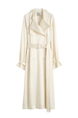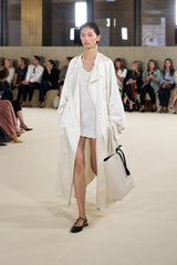 A Spring Summer 26 runway piece. Ankle-length trench cut from fluid satin with an integrated storm flap that shapes the sleeves with soft volume. Accented with a belted waist and cuffs, it drapes like a refined dressing gown over day and evening looks.