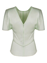 A deep-V neckline at the back creates a contemporary contrast with the demure round neckline, draped sleeves and modest over-the-hip hemline of this style. Crafted from crepe back satin, it is finished with an exposed baby-overlocking detail at the hem and back waist seam.