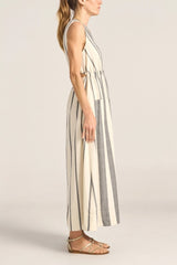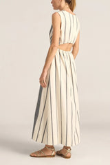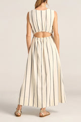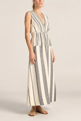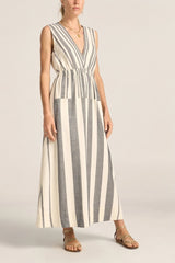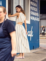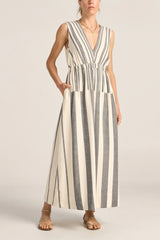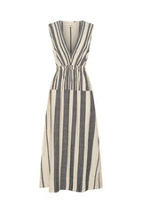 The Eirene Dress is a classic silhouette with a feminine edge. Crafted in our signature black and white broken stripe, it is a true labour of love—meticulously woven one thread at a time, by our artisans in India on traditional handlooms, each piece takes days to complete. This sleeveless style features a flattering V-neckline, an elasticated waistband that softly cinches the body, and a peek-a-boo detail at the back waist for a touch of skin. Long length, the flowy skirt features side pockets and side slits to allow for ease and movement, making this dress a perfect piece for warm, sun-filled days. A celebration of craftsmanship and slow fashion for modern life.