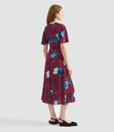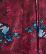 This mulberry dress is cut from lightweight crepe that is decorated with blue roses. It is gathered at the crew neckline and falls to a flared skirt.