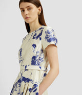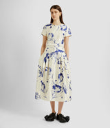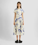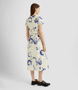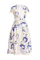 Made from white satin, this A-line dress has a drop waist and self-tie belt. The textured fabric is decorated with contrasting blue carnations.