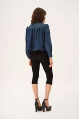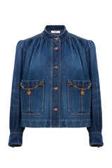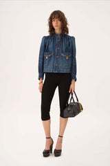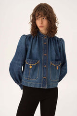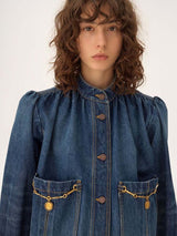 Designed for Chloé's Horse Capsule, this rigid indigo denim jacket has a gathered silhouette with puffed sleeves and front flap pockets detailed with gold-tone chain trims.