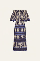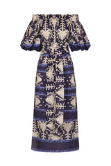 An off-the-shoulder midi dress crafted from breathable light poplin in navy and ecru. Voluminous puffed sleeves and a cinched waist create a striking silhouette, while the JO print adds a bold touch. Designed for effortless day-to-night wear, finished with a sash for a customisable fit. Closure: Slip On