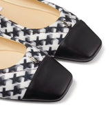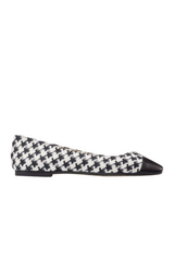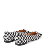 The Gisela flats from Jimmy Choo in cream and black houndstooth star print and black nappa leather. The ballerina style has square toes capped in contrasting black leather and finished with the brands monogrammed JC.