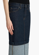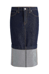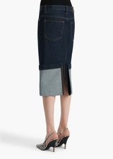 A robust and sophisticated column skirt made in Los Angeles of classic indigo denim traced by marigold topstitching. Designed to sit low on the hips for an elongating effect, the five-pocket silhouette is eased by a back vent. A tacked cuff reveals the lighter, seamed reverse. Signature nickel button.