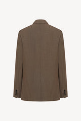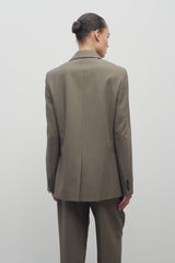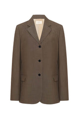 Single-breasted tailored jacket in fluid virgin wool and silk suiting with notch lapel, front flap pockets, and horn button closure.