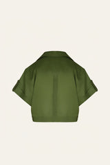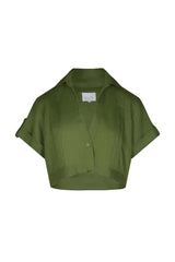 A cropped shirt cut in linen, in green. Defined by its sharp collar, single-button front, and boxy short sleeves. Style with the matching pant for a coordinated look.