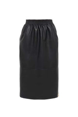 Knee-length pencil skirt in plongé nappa leather with an elastic waistband, signed with a gold-tone Chloé logo triangle at the hem.