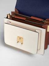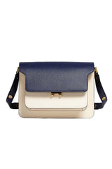 Marni's iconic Trunk bag is re-styled in new colourblock combinations, medium size, saffiano leather with two zipped pouches and four internal compartments. There is a front pocket under flap, back slip pocket and fabric lining. Adjustable leather shoulder strap with snaps and extender. Push-lock fastening. Gold hardware. Hot-stamped label logo under flap.