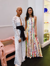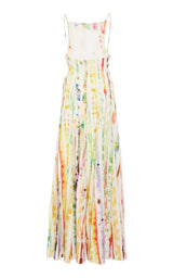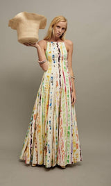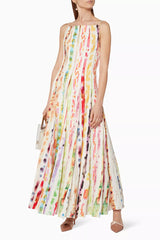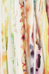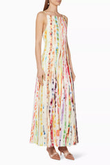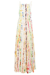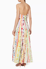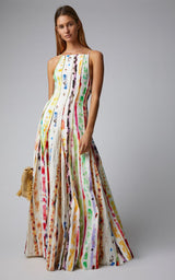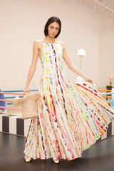 Hand painted watercolour stripes line this custom-printed cotton faille dress. A pin-tucked fitted bodice lets loose into cascading pleats, while a high square neckline dips low in back.