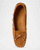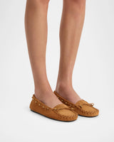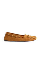 The Milly moccasin has been crafted in Italy from suede calfskin. The design is detailed with threaded leather adorned with gold beads.