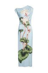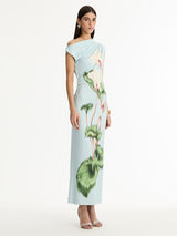 A cyclamen print inspired by the chiné weaving technique adds timeless appeal to this midi dress. It's finished with an off-shoulder neckline and slim, stretchy fit.