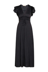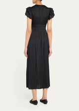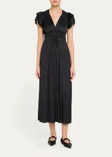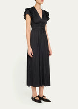 The Ulla Johnson Patrice dress features pleated fabric, short flutter sleeves, and a v-neckline. This A-line silhouette dress falls below the knee and has a slipover style. Made of polyester.