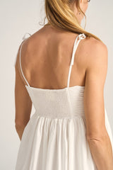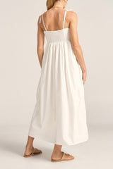 The Philomela Dress is a soft, feminine silhouette crafted from crisp cotton poplin. Featuring side seam pockets, adjustable tie straps and a fitted panelled bustier, with smocking at the back for an easy fit. The dress is finely gathered into the under bust and billows out into a relaxed shape that combines comfort with artisanal detail.