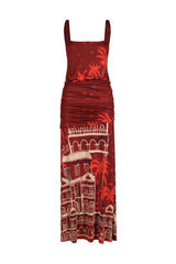 An ankle-length dress crafted in shiny jersey, featuring one of Johanna Ortiz’s signature architectural prints. The gathered waistline and fluid drape create a flattering silhouette that moves beautifully—perfect for daytime gatherings that transition effortlessly into evening moments.