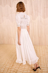 The Ren Skirt is crafted from white water-washed poplin enlivened by degradé eyelets that undulate across the silhouette. Designed to sit high on the waist, it unfurls to a full skirt trimmed with scalloping for added dimension.