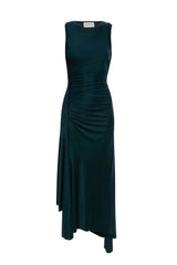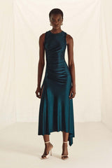 Cut from fluid satin, this midi dress has a fitted bodice and an asymmetric skirt, both shaped by gathers and ruches. Lean into the metallic finish with your selected accessories.