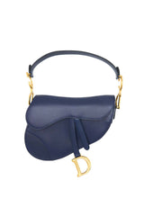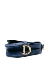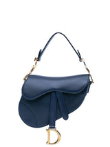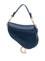 Crafted in navy grained calfskin, the legendary design features a Saddle flap with a D stirrup strap and magnetic pull, as well as an antique gold-finish metal CD signature on either side of the handle. Equipped with a thin, adjustable and removable strap, the Saddle bag may be carried by hand, worn over the shoulder or crossbody.