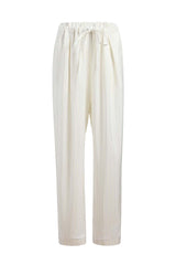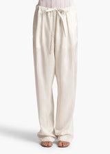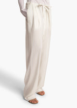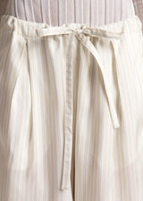 A relaxed, pleated-front pant refined by silky stripes. With grommeted drawstring waist, in-seam side pockets, and back welt pocket.