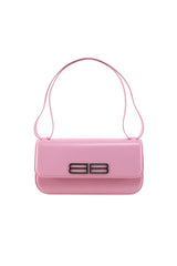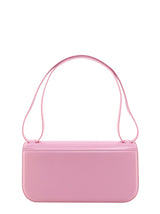 Double-shoulder strap, flap closure at front, metallic brand plaque at front, silver-toned hardware, all-over grained texture, external slip pocket at back, dual-compartment, internal zip pocket, debossed branding at interior, internal slip pocket.