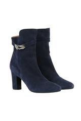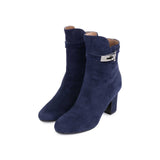 These suede navy blue Hermès Joueuse ankle boots feature a block heel, a rounded toe and the brands iconic silver lock turn hardware.