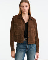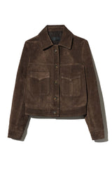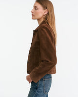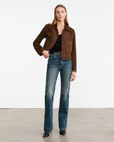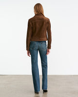 Slim boxy fit cropped jacket. Double needle topstitching. Functional centre front closure. Western-inspired details with clean sleeves and seam accents. Logo buttons. Fully lined.