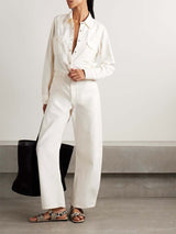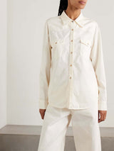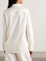Classic, straight fit collared jean shirt in Japanese denim. Western details. Pearl snap buttons. Chest flap pockets. Standard placket. Centre front buttons. Buttons at cuff.