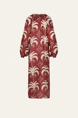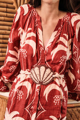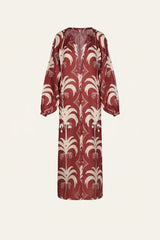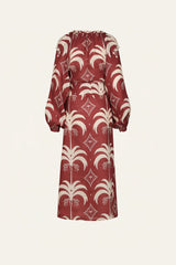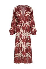 A linen midi dress defined by its deep V-neckline and voluminous sleeves. Designed with a tie-front detail that cinches the waist, it balances ease and elegance. Its flowing silhouette makes it ideal for warm-weather escapes and elevated resort dressing.