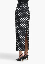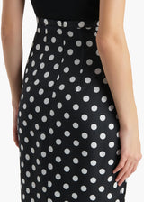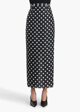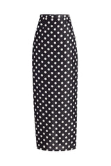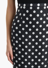 An elongated pencil skirt made in Italy of boldly dotted silk gazar selected for its smooth, sculpted structure. Tapered silhouette framed by a contoured waistband and refined darts for a sleek, tailored fit. Back slit for ease of movement. Concealed zipper closure at back. Lined in soft silk habotai.